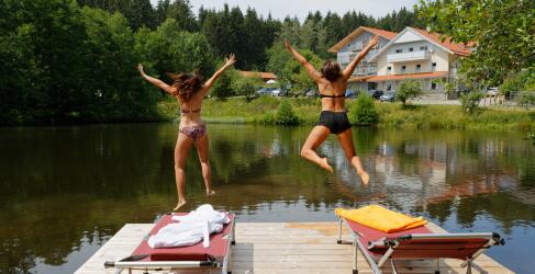 Im Hotel Deine Auszeit erwarten dich ein beheizter 24h-Innenpool, verschiedene Saunen, Dampfbad, Infrarotkabine, Whirlpool sowie ein Natur-Badeweiher – ideal für Wellness im Bayerischen Wald.